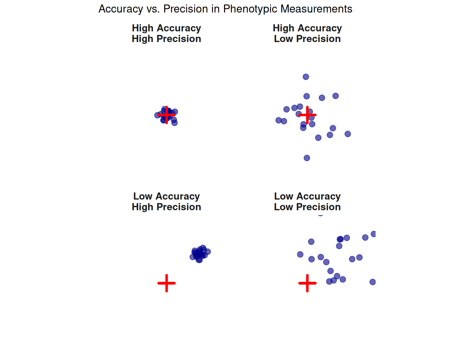 Explain the difference between accuracy and precision in phenotypic measurements. Provide an example of a measurement that could be: