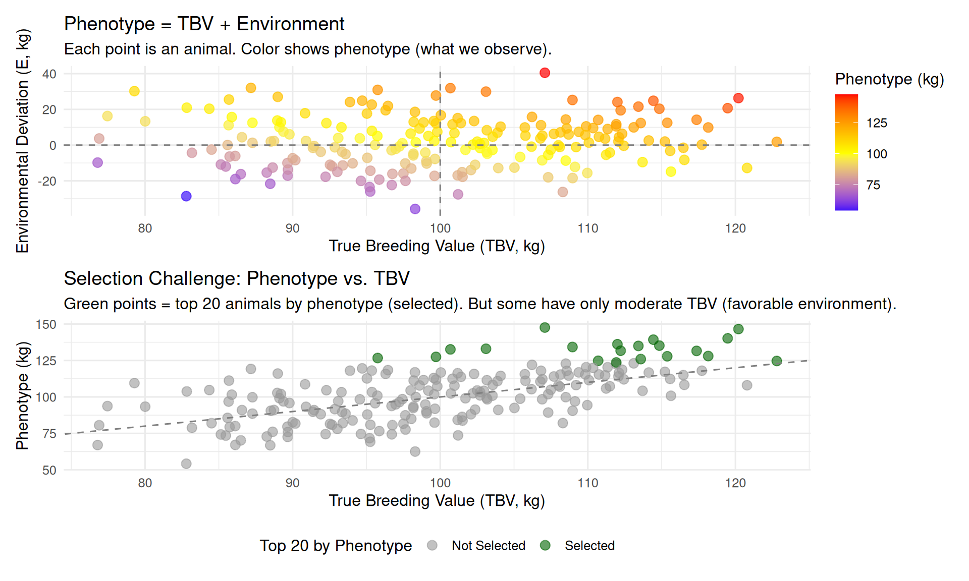 - If we select the top 20 animals by phenotype, would they also be the top 20 by TBV? Why or why not?