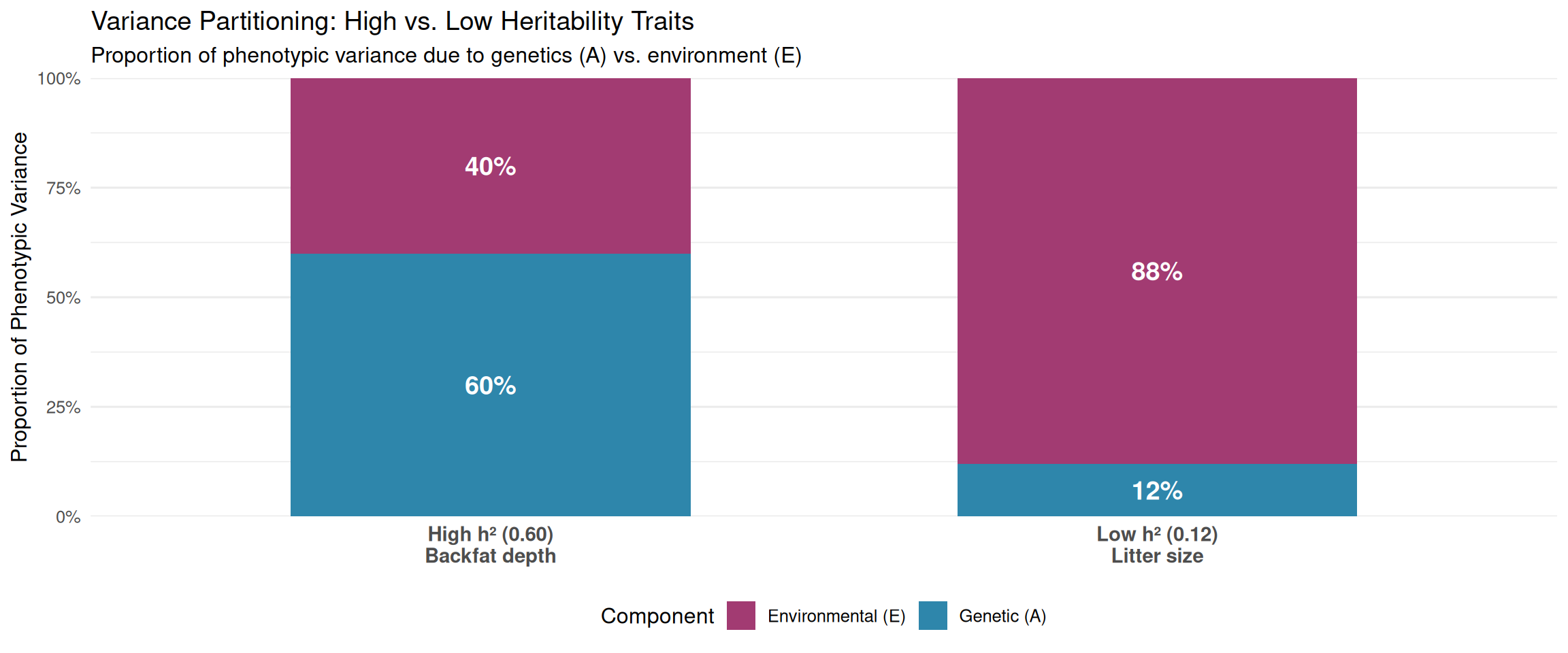 - Low \(h^2\) (0.05–0.20): Reproductive and fitness traits → challenging selection