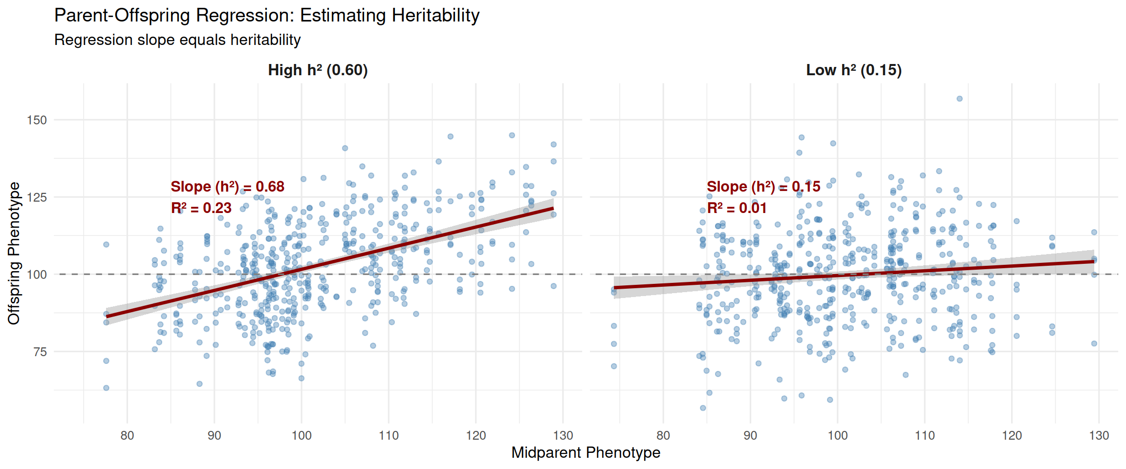 Parent-offspring regression slope equals heritability: \(\beta = h^2\)