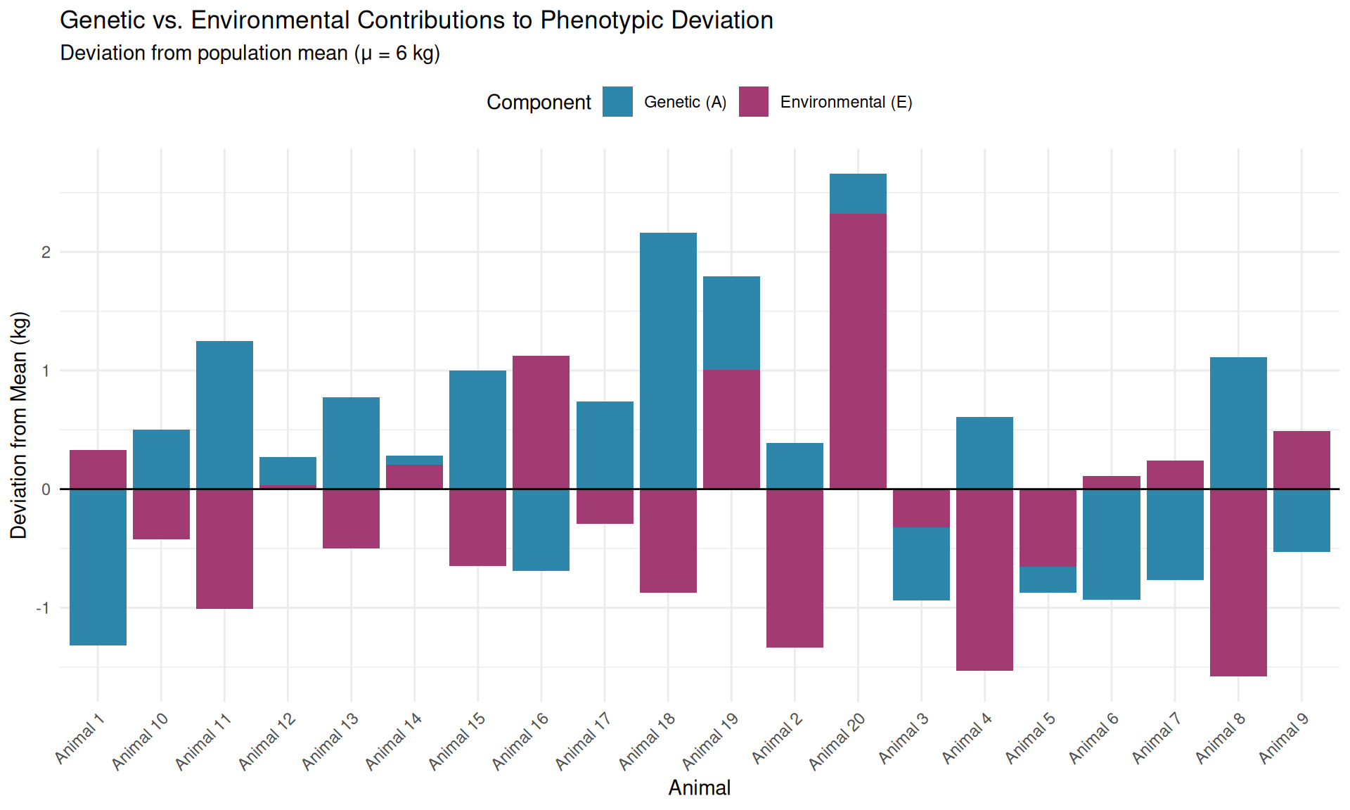2. Environmental effects (different phenotypes): Each sibling experiences unique environmental effects (\(E\)) that affect its phenotype. Even siblings raised in the same pen don’t have identical environments—they compete for feed, experience different health challenges, and undergo random developmental variation. These environmental differences create phenotypic variation even if siblings had identical breeding values.