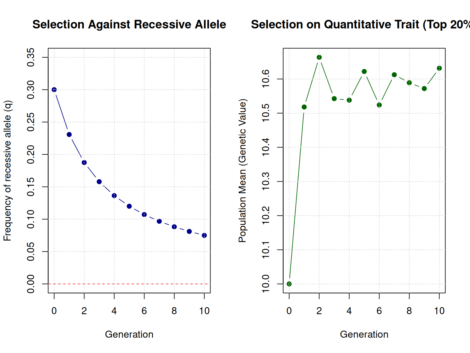 Because simply inherited traits are controlled by one or a few genes, allele frequencies can change very quickly under selection. If a desirable dominant allele is rare, it can become common within 2-3 generations of intense selection. If an undesirable recessive allele needs to be eliminated, molecular testing allows identification of heterozygous carriers, enabling complete elimination in 1-2 generations if desired (though this may reduce genetic diversity for other traits).